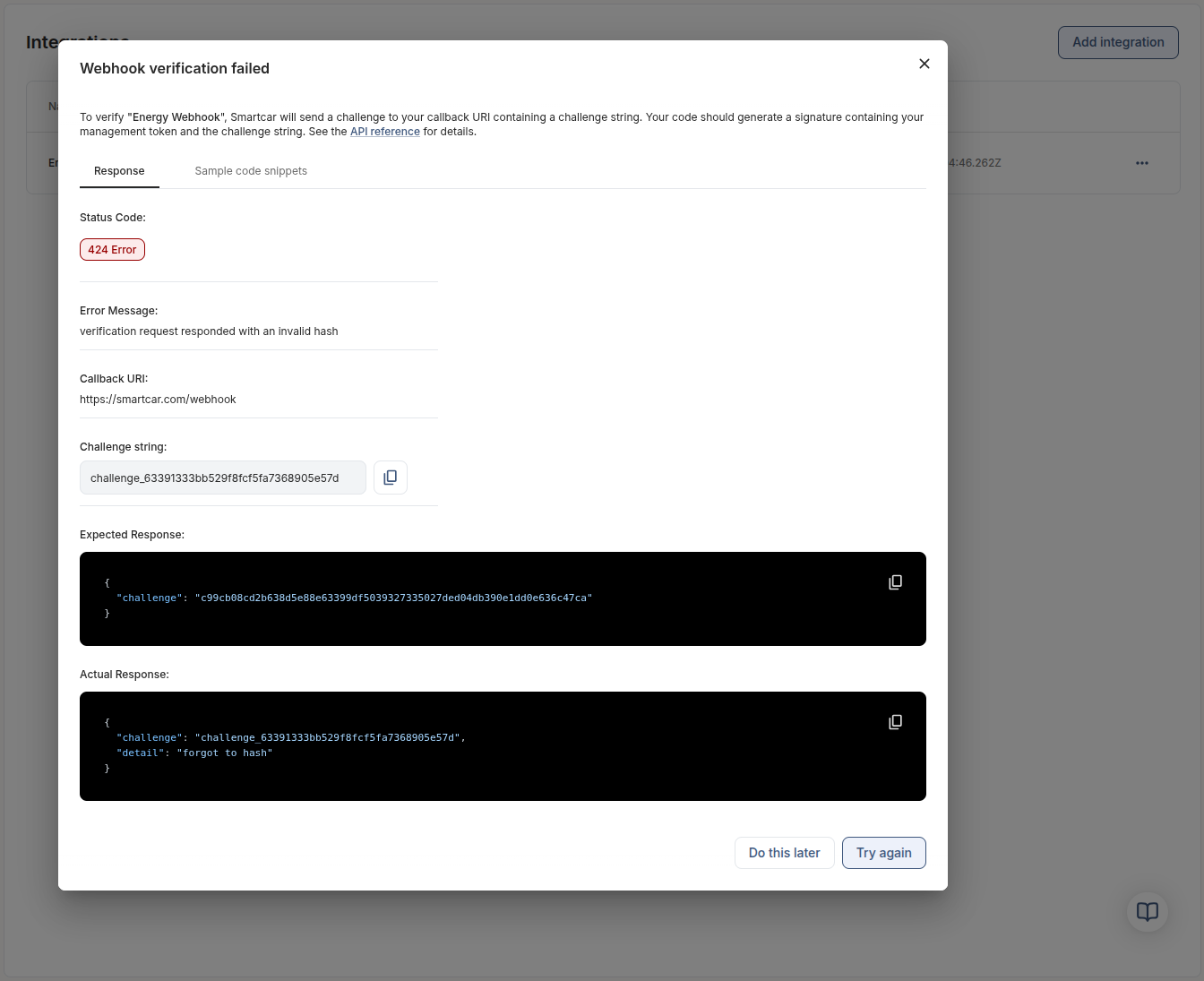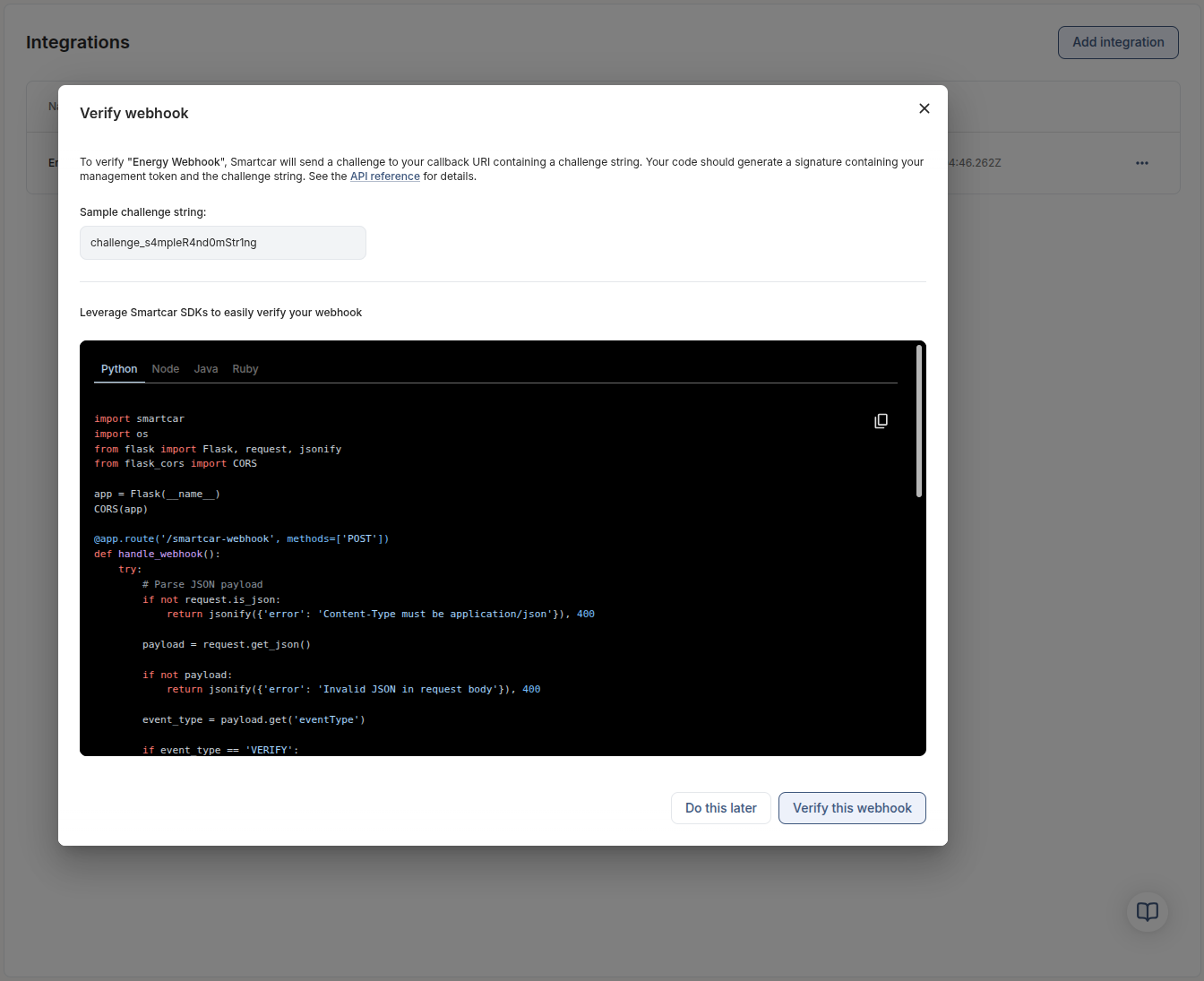 Copy the challenge string from the modal and use the embedded snippets (Python, Node, Java, or Ruby) as references while you code the signature logic on your server. Run your handler locally or in staging so it is ready to answer Smartcar’s challenge.